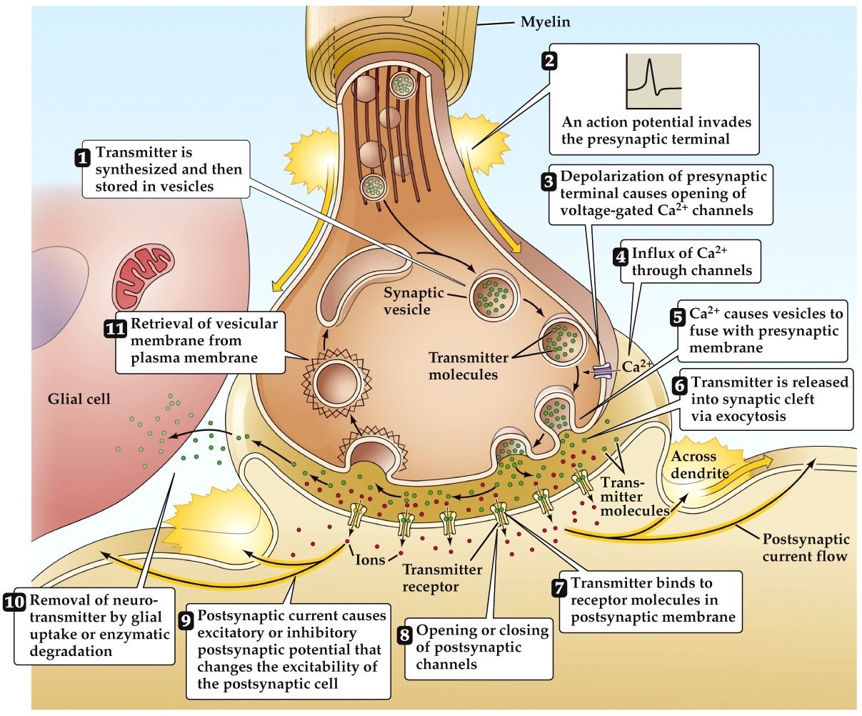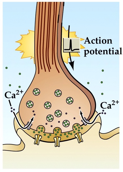 - Action potential in the presynaptic neuron opens voltage-gated Ca²⁺ channels