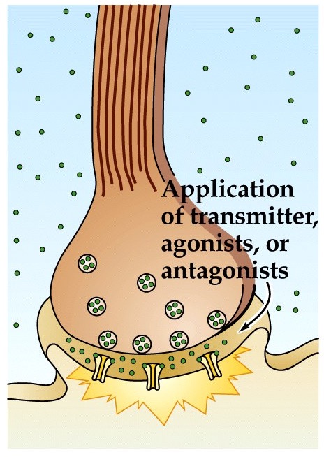 - Neuroransmitter binds to receptors on postsynaptic cell