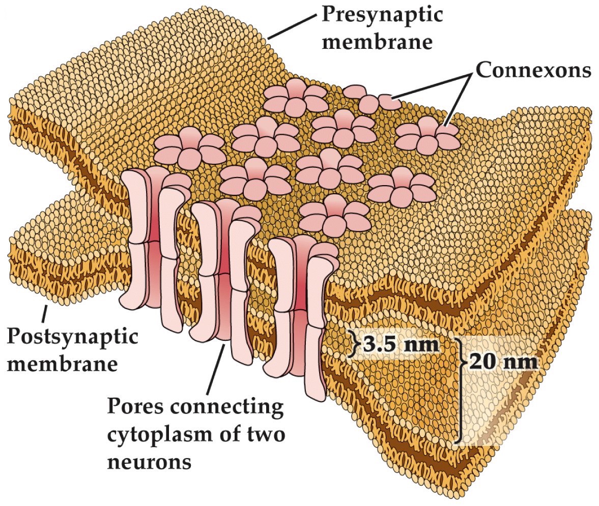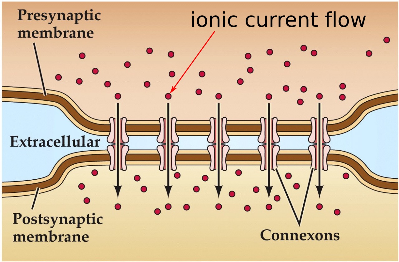 - Current flows directly from one neuron to another via gap junctions– form large pores (compared to ion channels) between cells made up of connexin proteins