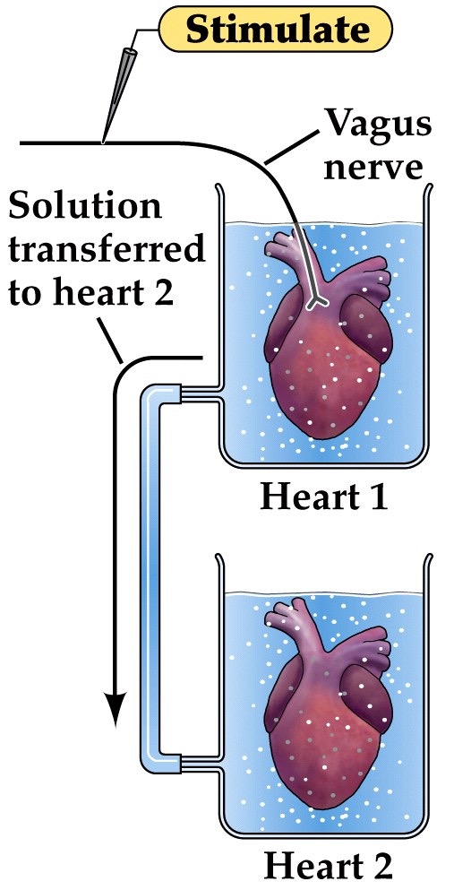 - Loewi transfered a solution generated from one heart to slow down another heart even without stimulation