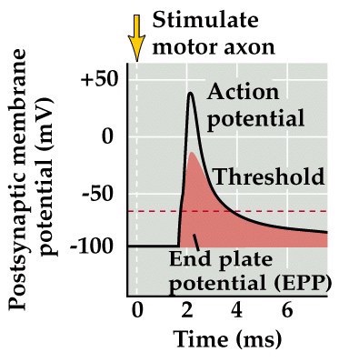 End plate potentials evoked by motor neuron stimulation almost are almost always above threshold and result in an action potential along the muscle fiber.