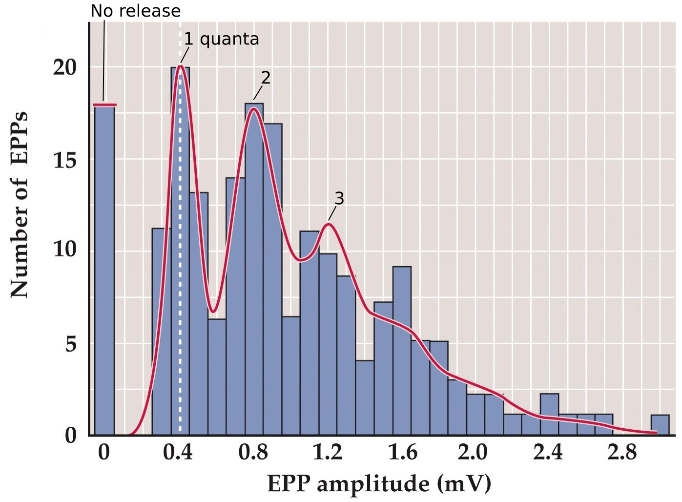 Poisson statistics used to analyse independent occurence of unitary events. Red curve shows what the distribution would expected to be if neurotransmitter release is quantal, made up of discrete message packets (vesicles) made of multiples of MEPP amplitudes (e.g. 0.4 mV)