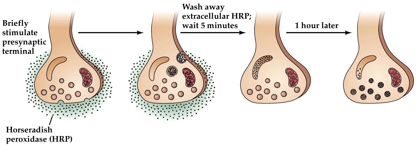 Pulse chase experiments by Heuser and Reese, 1973. HRP enzyme forms dense reaction product, can be visualized easily in electron microscopy.