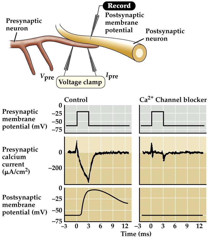 - Voltage clamping shows that there is an inward Ca²⁺ flux in presynaptic cells that is voltage dependent