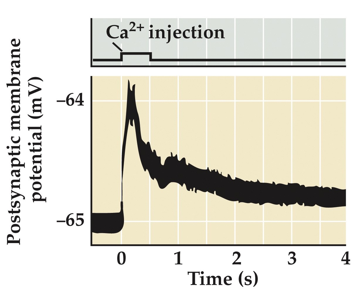 - Injection of Ca²⁺ into the presynaptic neuron can drive a post-synaptic potential