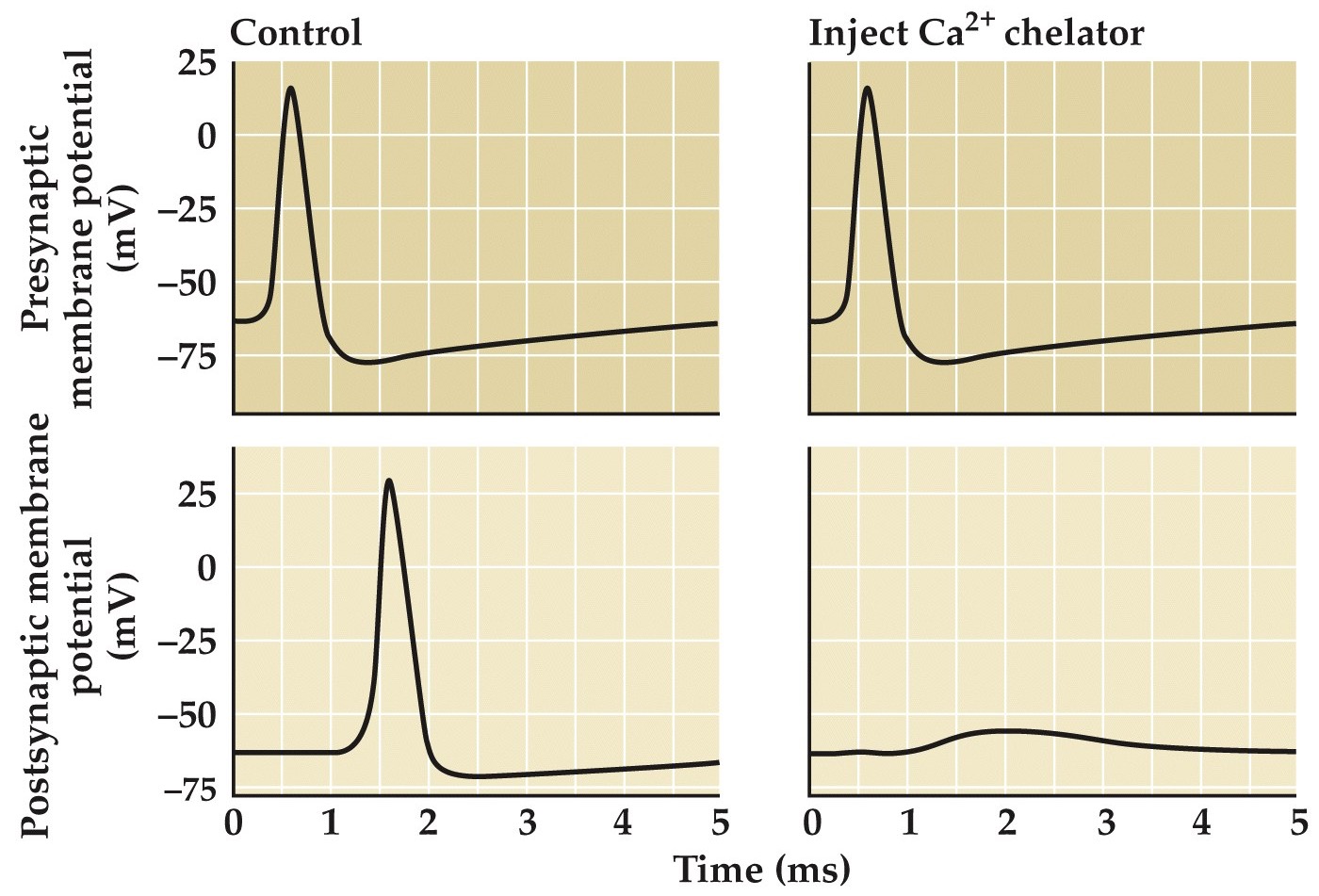 - Chelating Ca²⁺ in the presynaptic cell can inhibit post-synaptic potential