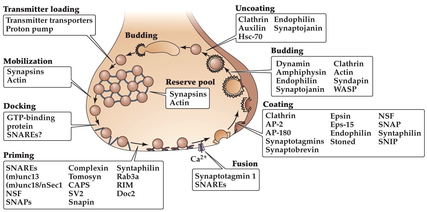 Many proteins specific to presynaptic terminals have been isolated. These proteins are required for different steps of vesicle cycling: budding, docking, priming, fusion.