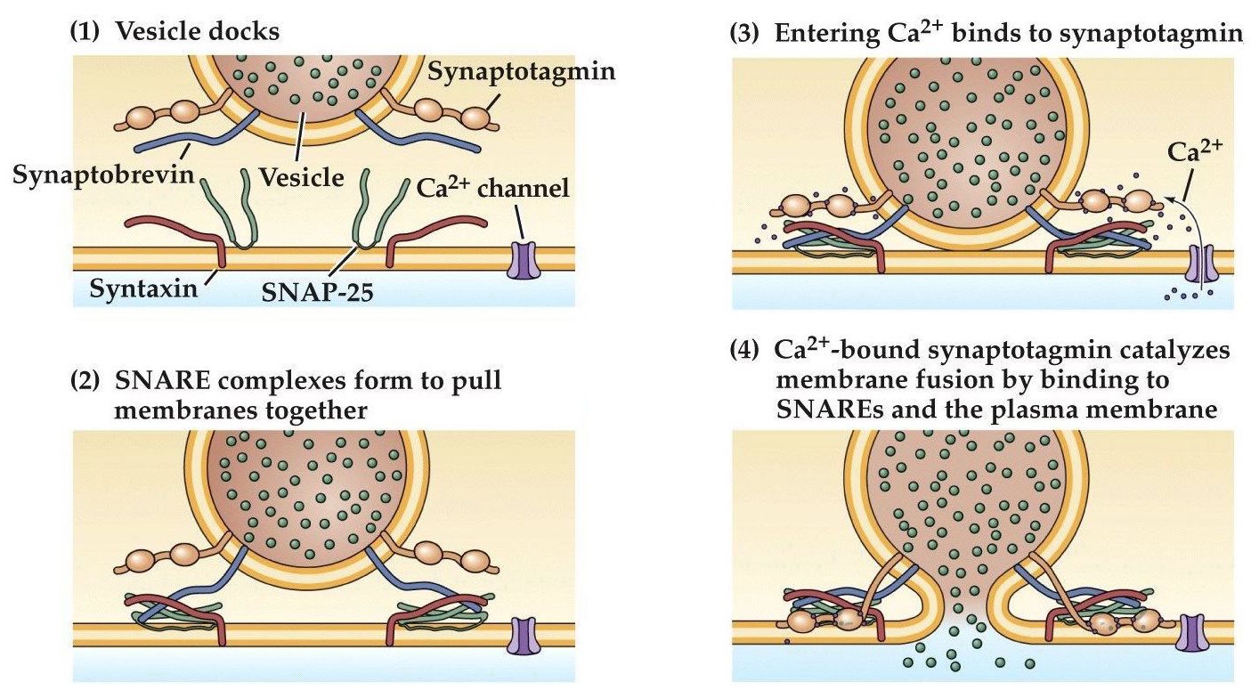 Just know there are is a calcium sensitive protein called synaptotagmin and that there are proteins like SNAREs that help dock and pinch membranes together